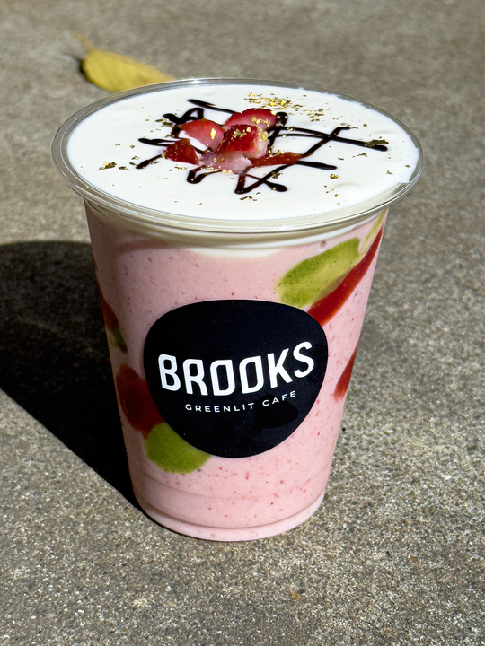 BROOKS GREENLIT CAFEで定番商品としてご提供しているスムージー「Berry Dreamy」を、クリスマスだけの特別仕様にアレンジしました。プレマ・オーガニック・ファームの小松菜入りのアボカドピューレとチョコレートソース、ストロベリー、甘酒入り豆乳クリームが重なり合う、華やかな味わいに仕上げました。ピンク、グリーン、チョコレートの3色が織りなす、目にも楽しいプラントベース・スムージーです。